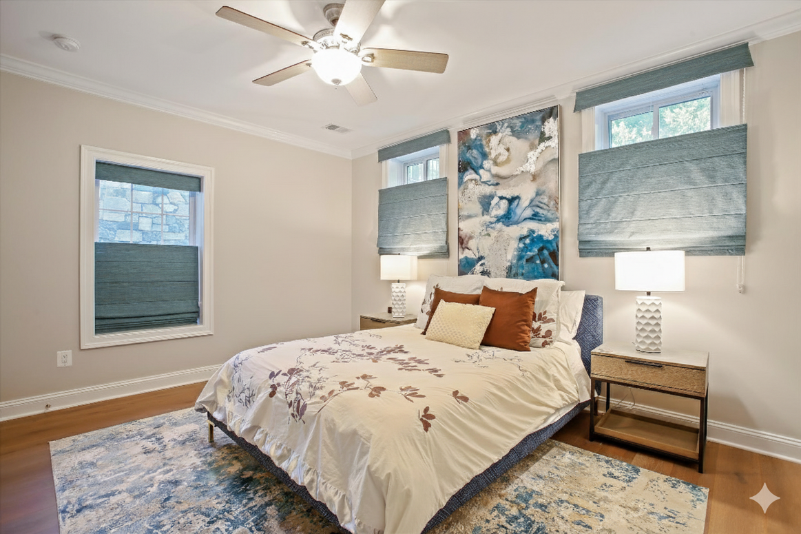 This lower-level guest room got a smart redesign. We reworked the layout, tucked the bed perfectly between the transom windows, and used custom shades to make them feel like full-size windows (sneaky, right?). Add a new bed, rug, painted walls, side tables, and lamps—and suddenly this space is lighter, brighter, and actually feels like a guest retreat.